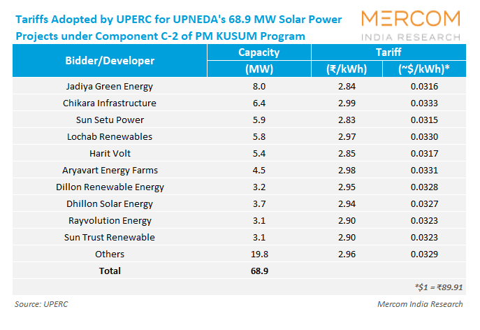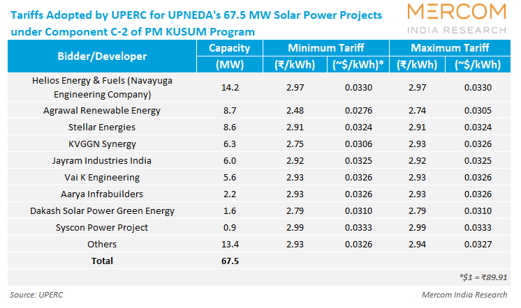 In November, UPERC adopted the tariffs discovered through the competitive bidding process for 25 solar projects totalling 82.6 MW under the PM-KUSUM program.