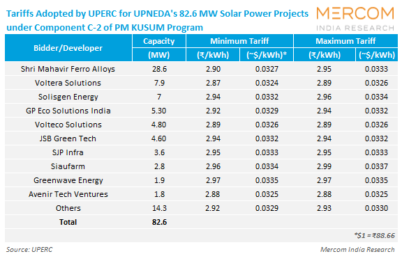 The accepted tariffs across these projects range from ₹2.87 (~$0.0323)/kWh to ₹2.99 (~$0.0337)/kWh.