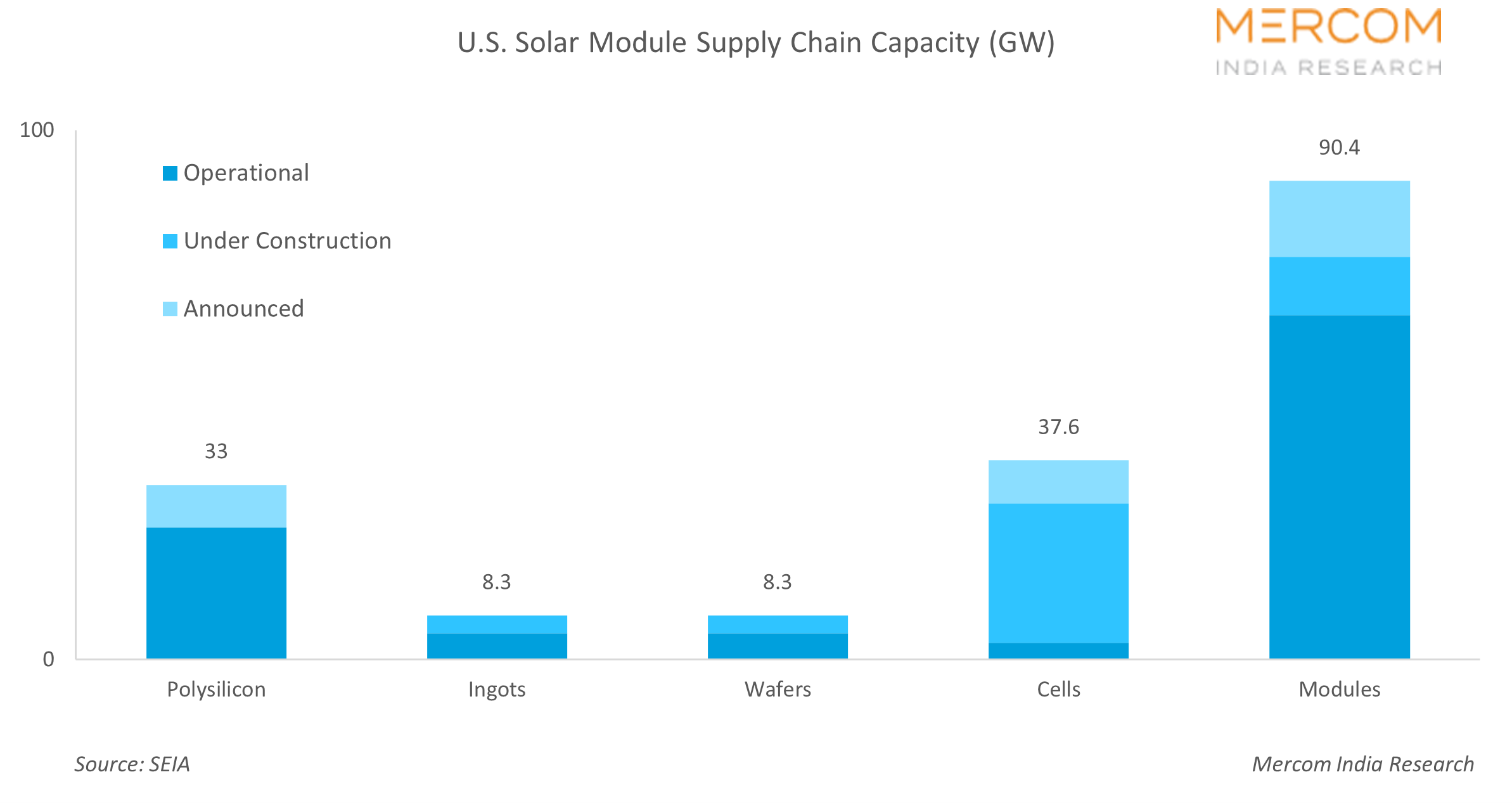 But how grounded in reality is the optimism? Consider this: the U.S. has over 65.1 GW of operational domestic module manufacturing capacity as of February 2026, with another 30 GW under construction and announced projects expected to come online during this year, according to the Solar Energy Industries Association (SEIA). The existing module capacity and the pipeline will largely meet the domestic demand. Just like India, the U.S. has been vigorously promoting reshoring initiatives to enable a supply chain that will gradually reduce reliance on overseas supply.