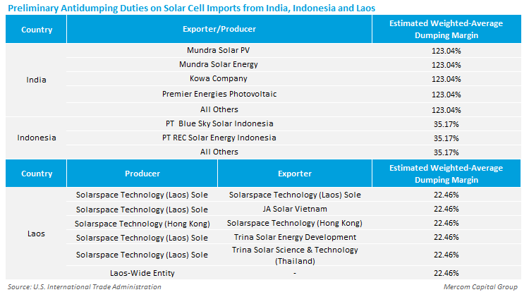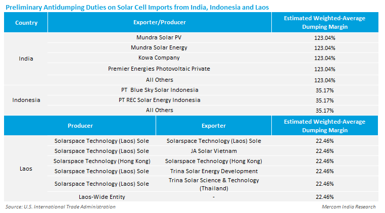 For India, the Commerce Department assigned an estimated weighted-average dumping margin of 123.04% to Mundra Solar PV, Mundra Solar Energy, Kowa Company, and Premier Energies.