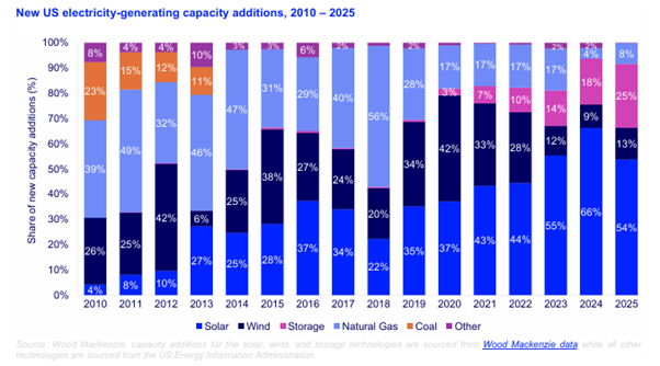 Even with the annual decline, solar remained the dominant source of new electricity generation, accounting for 54% of all new electricity-generating capacity added to the U.S. grid during the year. Solar and storage together made up 79% of all new capacity additions.