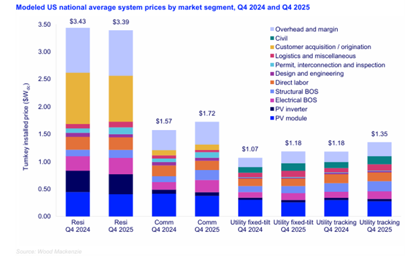 System pricing rose across most market segments in Q4 2025. Residential pricing was the exception, declining 1% year-over-year to $3.39/W. Commercial system prices increased 10% to $1.72/W, while utility-scale system prices rose 11% to $1.18/W for fixed-tilt systems and 14% to $1.35/W for single-axis tracking systems.