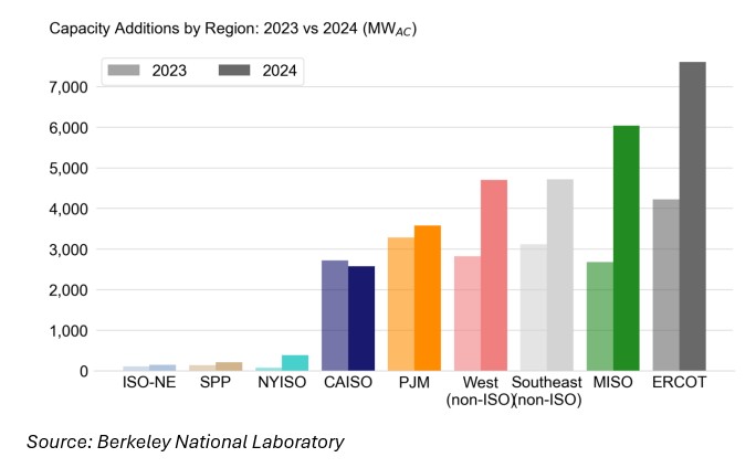 However, the report stated that the new capacity is not uniformly spread across the U.S. The growth is concentrated in the Electric Reliability Council of Texas (ERCOT), with 7.6 GW, the Midcontinent Independent System Operator (MISO), with 6 GW, and the non-Independent System Operator (ISO) West and Southeast, both with 4.7 GW.