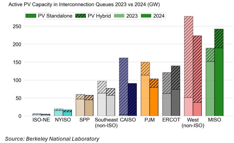 Across the U.S., 452 GW of queued solar capacity includes 47% battery capacity. The report states that hybridization is more common in regions with greater solar deployment, including CAISO (93%) and non-ISO West (83%).