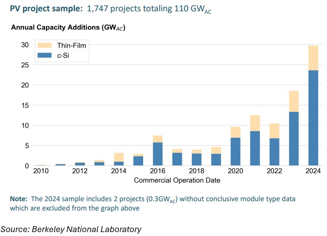 The use of crystalline silicone modules grew to 79% of added capacity in 2024. A dominant technology for large-scale projects in the U.S. since 2015, these modules saw a temporary decline in 2022 before resurging.
