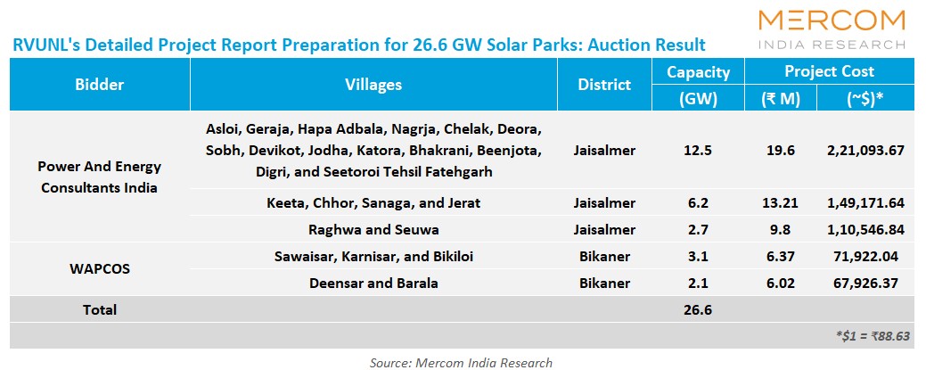 The two companies won the auction to prepare DPRs for a total capacity of 26.6 GW of solar parks. WAPCOS secured works for a capacity of 5.2 GW for a contract value of ₹12.39 million (~$39,848.41), and Power and Energy Consultants secured 21.4 GW for ₹42.61 million (~$480,812.15).